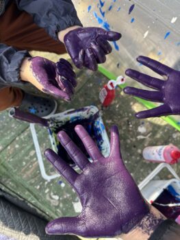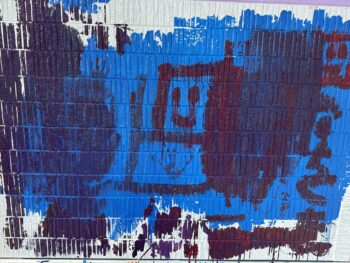 青のペンキを大胆に塗り、そこに赤を混ぜ